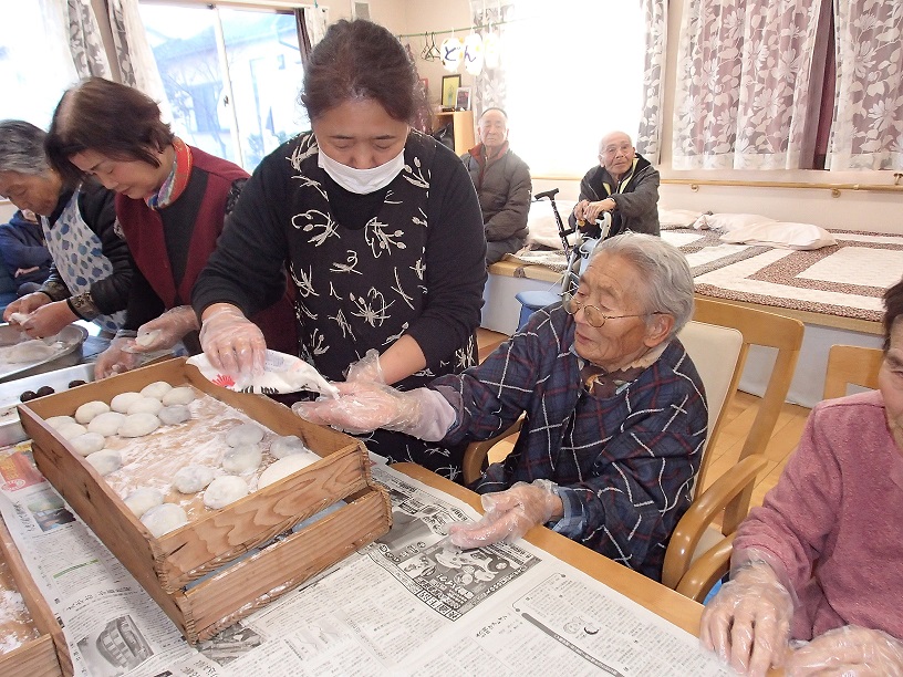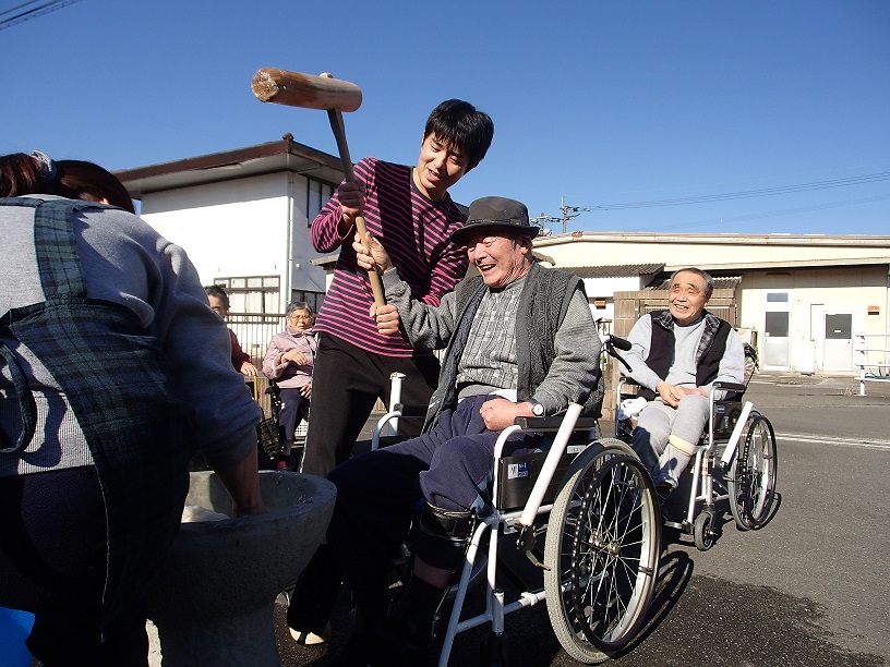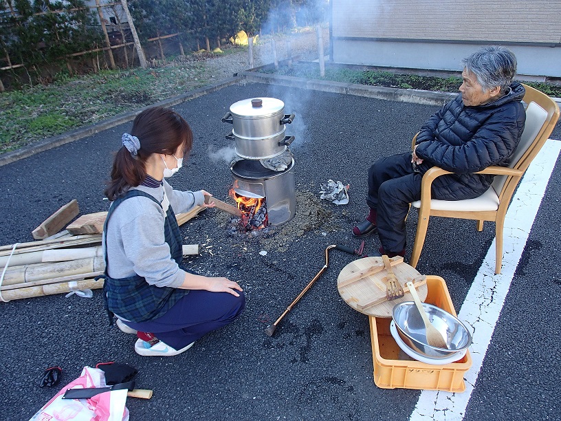 毎年恒例の餅つき。今年はかまどでもち米を蒸してみましたが、職員のあまりの手際の悪さに見かねて、通所御利用の方がご指導くださいました。
